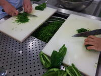 給食室では、赤パプリカ、ピーマン合わせて10キロを手で千切りにしました。