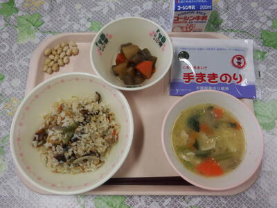 いり大豆の献立を考えました。ちらし寿司はのりでまいて、恵方巻のように食べることもできます。
