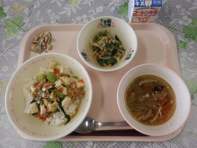 牛乳 チゲ豆腐丼 中華サラダ 春雨スープ 大豆小魚