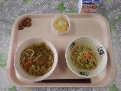牛乳 カレーうどん ツナ和え 手作りメープルマフィン 粒アーモンド