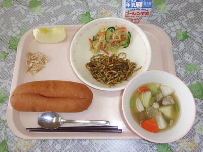 今日の給食は、焼きそばパンです。焼きそばは、パンにはさんで食べて