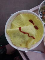 給食時間にクラスを回ったとき、卵の上にケチャップで絵を書いたのを見せてくれました。