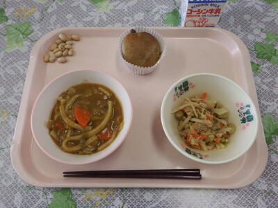 牛乳 カレーうどん ツナ和え 手作りほうじ茶マフィン
