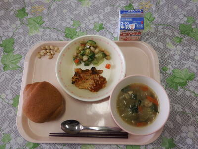 牛乳 はいがパン 白身魚のピザ焼き まめまめサラダ
