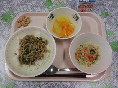 今日の給食は、チンジャオロースーをごはんにのせた、チンジャオロースー丼です。