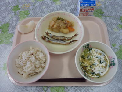 牛乳 梅ごはん ししゃも焼き 肉じゃが きのこ入りかきたま汁