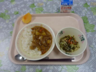 牛乳 ポークカレーライス すき昆布サラダ 柿
