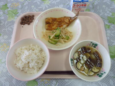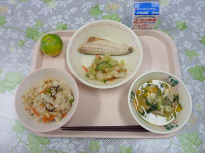 牛乳 大豆ごはん ほっけの干物 レモンじょうゆあえ かぼちゃ汁