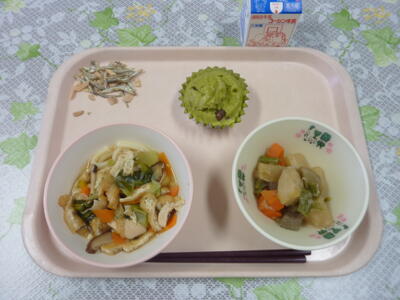 牛乳 きつねうどん 里芋と野菜の煮物 小倉抹茶蒸しパン アーモンド小魚
