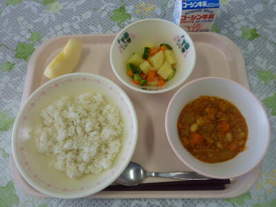 今日の給食は、今年度はじめて給食に出したりんごです。