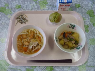 牛乳 キムチうどん 筑前煮 手作り抹茶豆乳マフィン 小魚