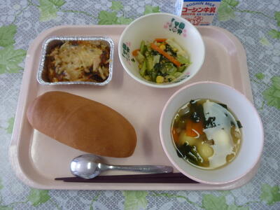 今日の給食は、旬のなすをたっぷり使ったミートグラタンです。
