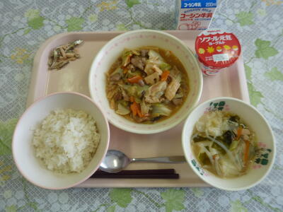牛乳 ごはん 回鍋肉 ワンタンスープ ヨーグルト アーモンド小魚