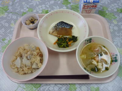 牛乳 さといもご飯 鯖のオレンジ煮 菊花あえ みそけんちん汁