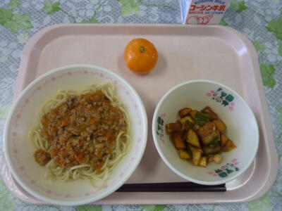 牛乳 肉味噌そば 白身魚とカシューナッツの揚げに 冷凍みかん
