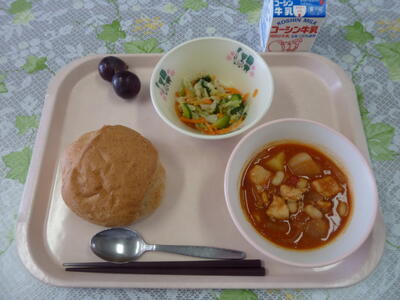 牛乳 胚芽パン 鶏肉と豆のトマト煮 ハニーマスタードドレッシングサラダ