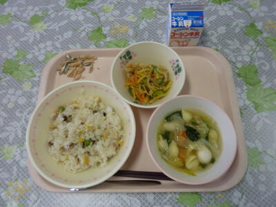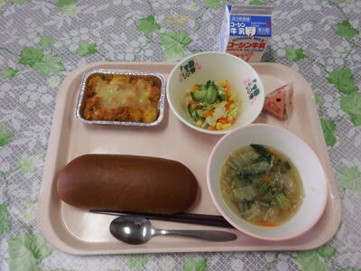 牛乳 黒糖パン じゃがいものミートグラタン 千切り野菜スープ コーンサラダ