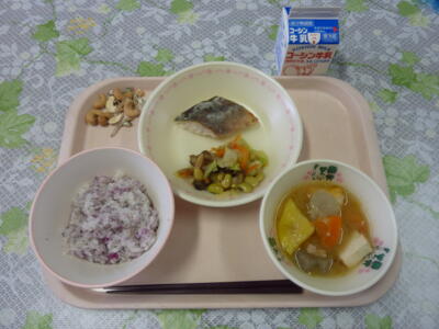 牛乳 ゆかりごはん ほっけの塩こうじ焼き 青大豆としめじの和え物 さつま汁