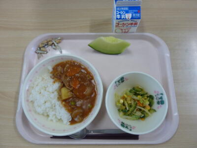 牛乳 ハヤシライス バジルドレッシングサラダ メロン 大豆小魚