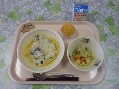 牛乳 サーモンクリームスパゲティ 青大豆とポテトのサラダ キャロットマフィン