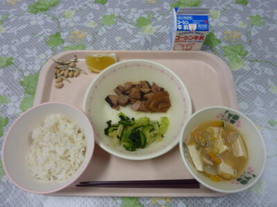 牛乳 ごはん かつおのしぐれ煮 ピリからあえ かぼちゃ汁 美生柑