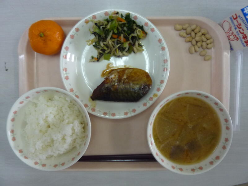 本日の給食は、ごはん、鰆の西京焼き、小松菜のおひたし、のっぺい汁、冷凍ミカン、炒り大豆、牛乳です。
