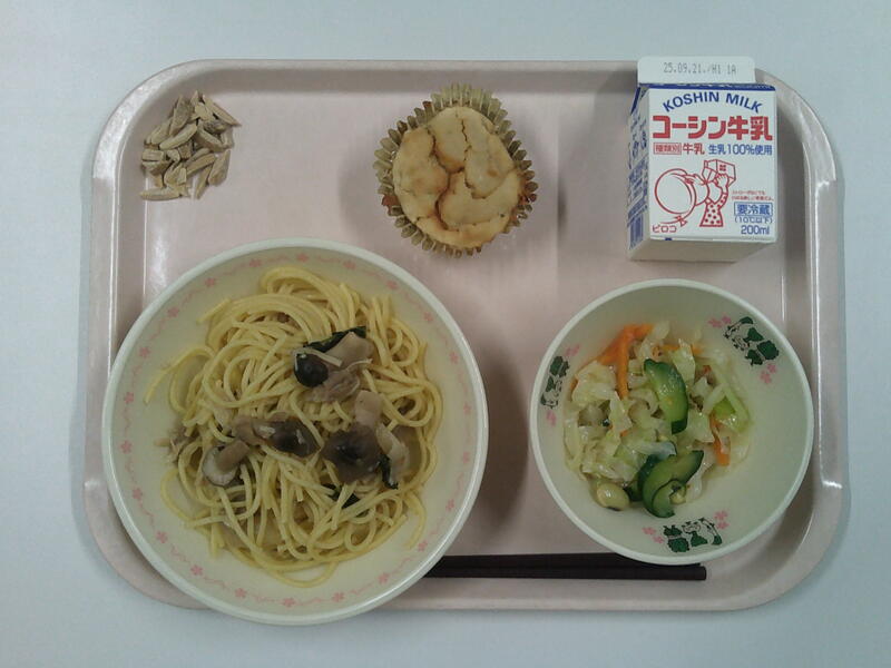 本日の献立は、しめじの和風スパゲッティ、梅ドレッシングサラダ、なしケーキ、アーモンド、牛乳です。