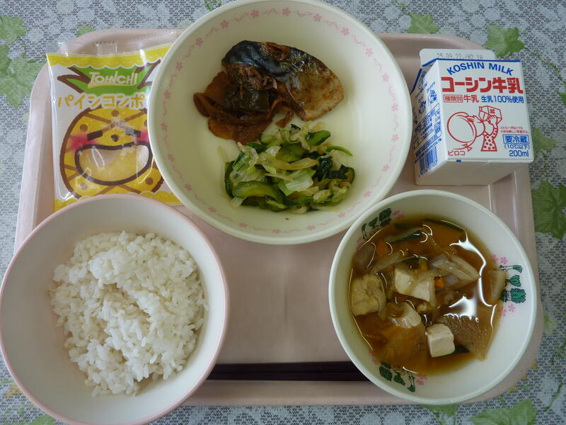 本日の献立は、ごはん、鯖の生姜煮、ピリ辛あえ、かぼちゃ汁、冷凍パイン、牛乳です。