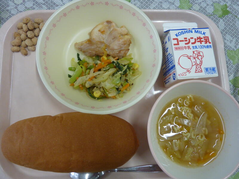 本日の献立は、コッペパン、鶏肉のマーマレード焼き、ABCマカロニスープ、バジルドレッシングサラダ、きなこ大豆、牛乳です。