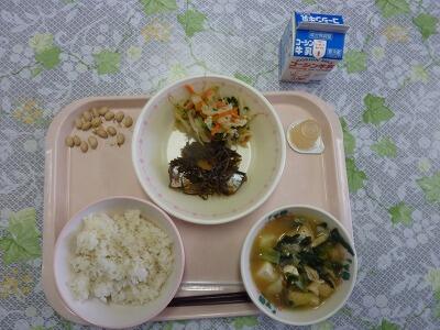 牛乳 ごはん さんまの松前煮 からしあえ なめこ汁 一口ピーチゼリー 炒り大豆