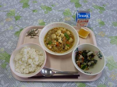牛乳 ごはん 豆腐のカレー煮 柏野菜とひじきのあえもの 河内晩柑 小魚