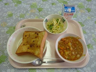 牛乳 アップルシナモントースト チリコンカン マカロニサラダ 小魚