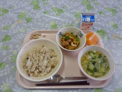 牛乳 柏のかぶの葉チャーハン 鶏肉とカシューナッツの揚げ煮 青梗菜のスープ デコポン 炒り大豆