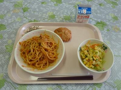 牛乳 スパゲティナポリタン コーンサラダ いちごのスコーン 大豆小魚