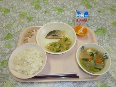 牛乳 ごはん いなだの照り焼き キャベツときゅうりのごま酢あえ みそけんちん汁 早香 炒り大豆