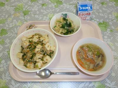 牛乳 麻婆豆腐丼 中華おひたし 白菜と豚肉のスープ 大豆小魚