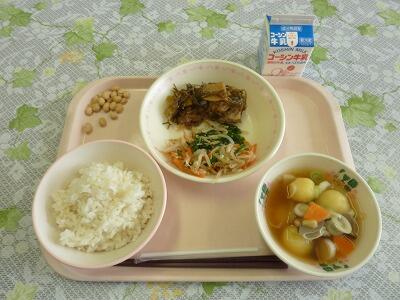 牛乳 ごはん さんまの松前煮 ごまあえ いも団子汁 炒り大豆