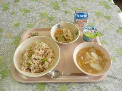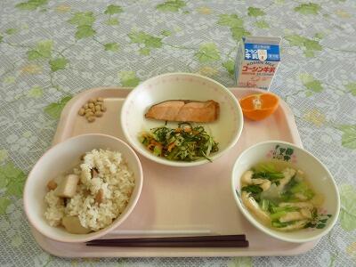牛乳 さといもごはん 鮭のバターしょうゆ焼き キャベツと昆布のレモンあえ 大根の味噌汁 みかん 炒り大豆