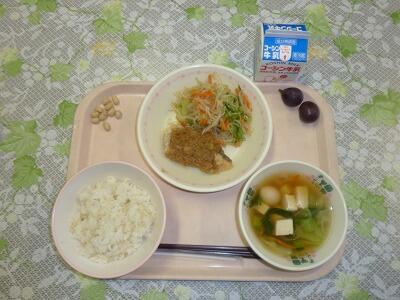牛乳 さつまいもごはん いわしのカレー揚げ キャベツときゅうりのごま酢あえ なめこ汁 みかん 炒り大豆