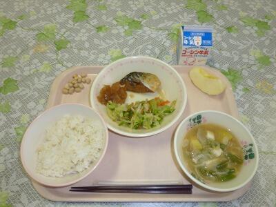 牛乳 ごはん 鯖の味噌煮 きゅうりのゆずあえ さつま汁 りんご 炒り大豆