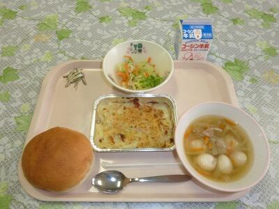 今日の献立は,えび入りマカロニグラタンです。マカロニ,鶏肉,えび,玉ねぎ,ひよこまめ,豆乳,牛乳,パン粉,チーズが入っています。久しぶりに出すグラタンです。好きな人も多いのではないでしょうか。味を楽しんでください。