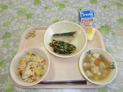 牛乳 栗ごはん 鰆の照り焼き のりあえ けの汁 りんご 炒り大豆