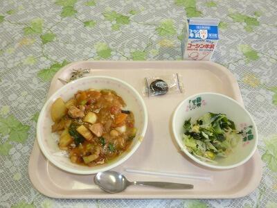 牛乳 地場産野菜のカレーライス わかめとコーンのサラダ プルーン 小魚