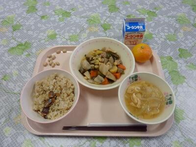 牛乳 さんまごはん 栗と秋野菜の煮物 たまねぎと油揚げの味噌汁 みかん 炒り大豆