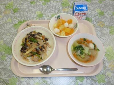 牛乳 チンジャオロース丼 春雨スープ フルーツ白玉 大豆小魚