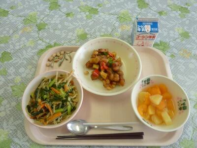 牛乳 味噌ラーメン 鶏肉とさつまいもの揚げ煮 フルーツポンチ 大豆小魚