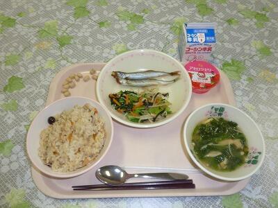 牛乳 とうふめし ししゃも焼き 磯香あえ えのきの味噌汁 アセロラゼリー 炒り大豆