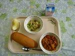 牛乳 はちみつパン 鶏肉と大豆のトマト煮 しめじ入りサラダ りんご 小魚