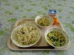 今日の献立は,中華炊き込みごはんです。具は焼き豚,干ししいたけ,にんじん,シャーミーを煮て,ごはんに混ぜます。シャーミーは干しえびのことです。干しえびのエキスがきいています。