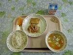 牛乳 大豆ごはん 鶏肉とだいこんの炒め煮 白菜と油揚げの味噌汁 みかん 小魚